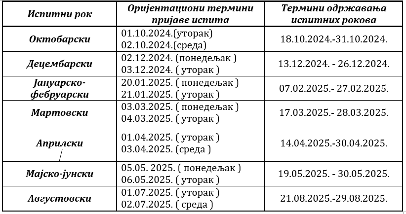ОРИЈЕНТАЦИОНИ ТЕРМИНИ ПРИЈАВЕ ИСПИТА И ОДРЖАВАЊА ИСПИТНИХ РОКОВА ЗА ВАНРЕДНЕ УЧЕНИКЕ И ЛИЦА НА ДОКВАЛИФИКАЦИЈИ И ПРЕКВАЛИФИКАЦИЈИ У ШКОЛСКОЈ 2024/2025. ГОДИНИ
