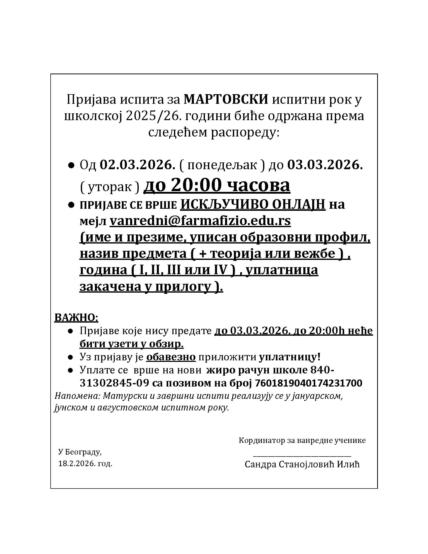 ● Од 02.03.2026. ( понедељак ) до 03.03.2026. ( уторак ) до 20:00 часова ● ПРИЈАВЕ СЕ ВРШЕ ИСКЉУЧИВО ОНЛАЈН на мејл vanredni@farmafizio.edu.rs (име и презиме, уписан образовни профил, назив предмета ( + теорија или вежбе ) , година ( I, II, III или IV ) , уплатница закачена у прилогу ).