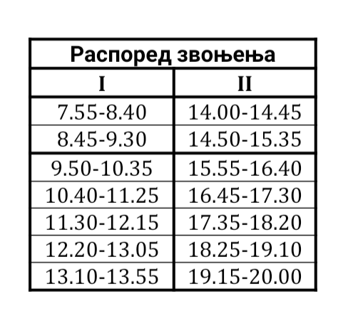 Распоред звоњења можете погледати на слици у наставку текста.