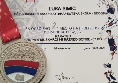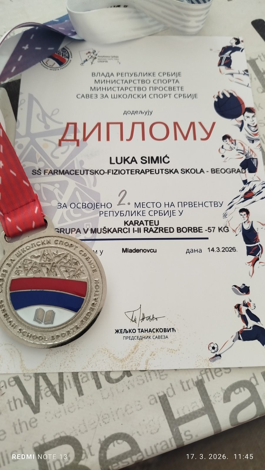 Ученик одељења I/5, Лука Симић, освојио је сребрну медаљу на Државном школском такмичењу у каратеу.